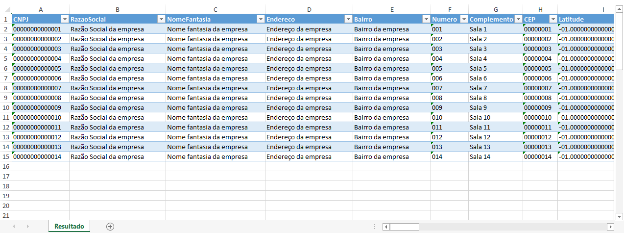 a) Dados Básicos: Dados que necessariamente aparecerão na lista básica e que consistem em: CNPJ, Razão Social, Nome Fantasia, Regulamentação, Natureza Jurídica, CNAE, Setor, Endereço, Bairro, Número, Complemento, CEP, Cidade, Estado, Região, Latitude, Longitude, Data Situação Cadastral RFB, Situação Cadastral, Data Abertura, Idade, Data Atualização Base IBPT, Simples Nacional, Inscrição Estadual, CNAE Secundário 1, CNAE Secundário 2, CNAE Secundário 3, CNAE Secundário 4, CNAE Secundário 5;